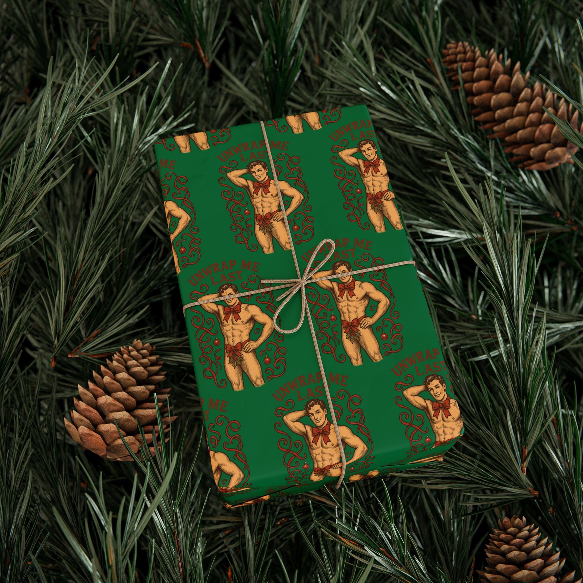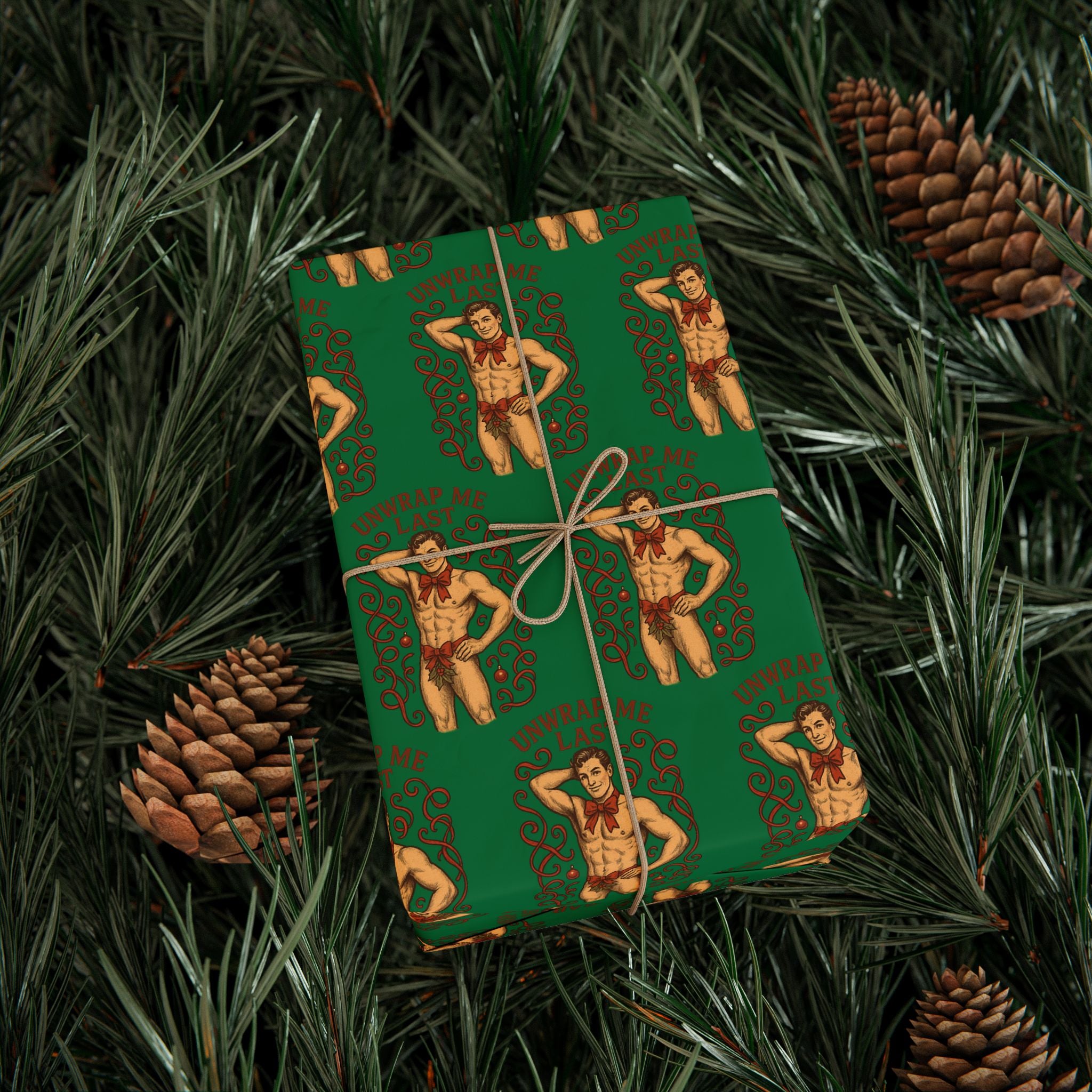 Stylish Vintage Holiday Male Pinup - "Unwrap Me First Design" - Dark Green Background