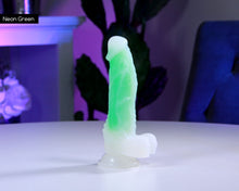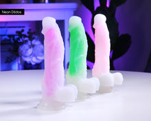 These vibrant silicone dildos are 8" from base to tip and come in three eye-catching neon hues like—purple, green, and pink—that also have dim a glow in the dark. A secure suction cup on the base allows it to be used in a variety of locations.